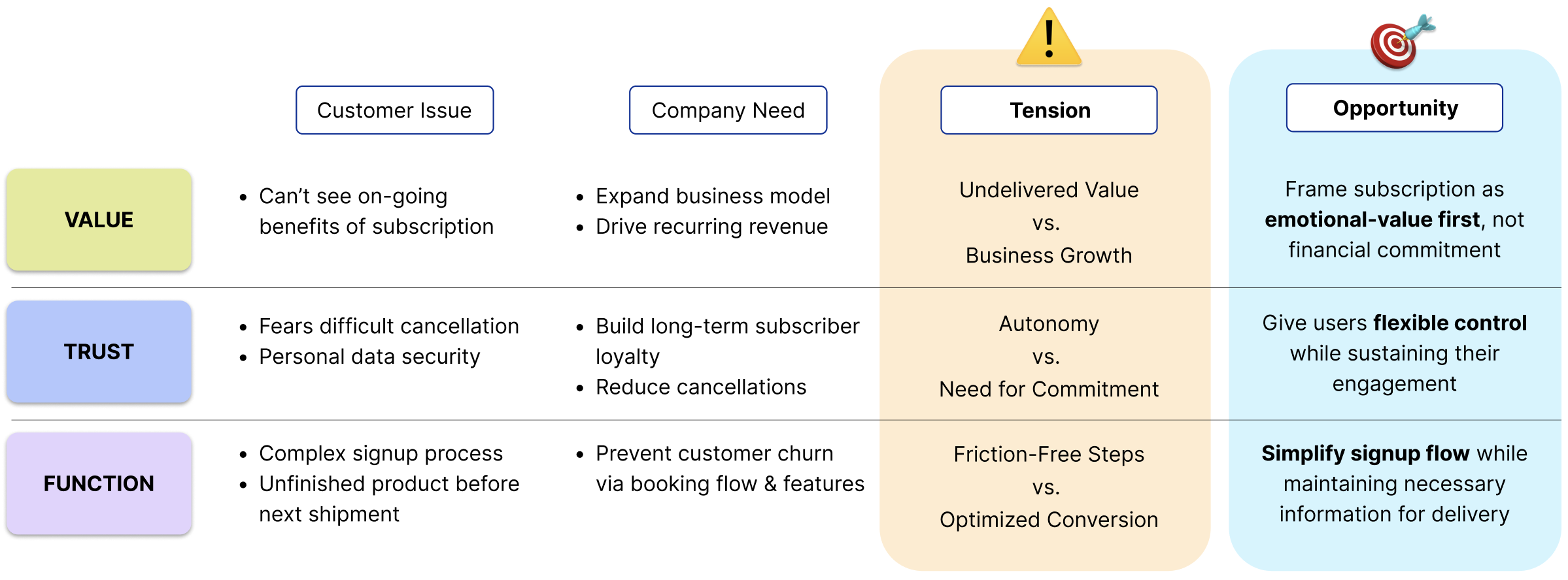 I conducted secondary research from Forbes, Harvard Business School, and McKinsey & Co. to understand company needs and customer pain points around subscription models. Next, I synthesized the findings into tension and opportunities on 3 levels.